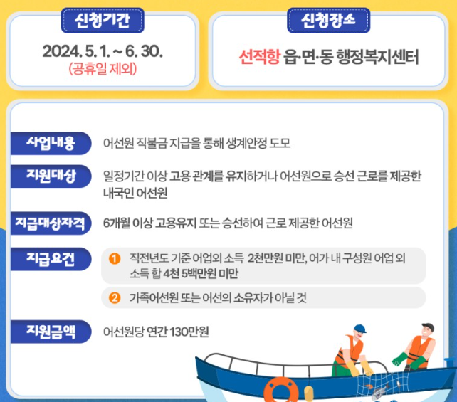 선적항 읍·면·동 행정복지센터에서 신청이 가능하며, 지원금액은 어선원당 연간 130만원입니다.
